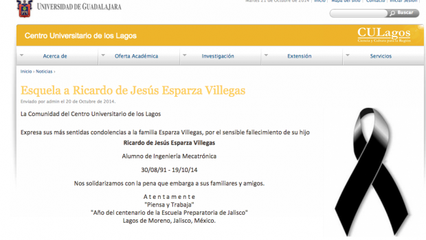 El sábado pasado, Ricardo de Jesús Esparza Villegas, estudiante del Centro Universitario de los Lagos (CULagos), llegó a Guanajuato, acompañado de un grupo de amigos, para asistir a los eventos del Festival Internacional Cervantino (FIC), para las 9:30 horas del domingo el joven fue encontrado muerto en el patio de una casa.